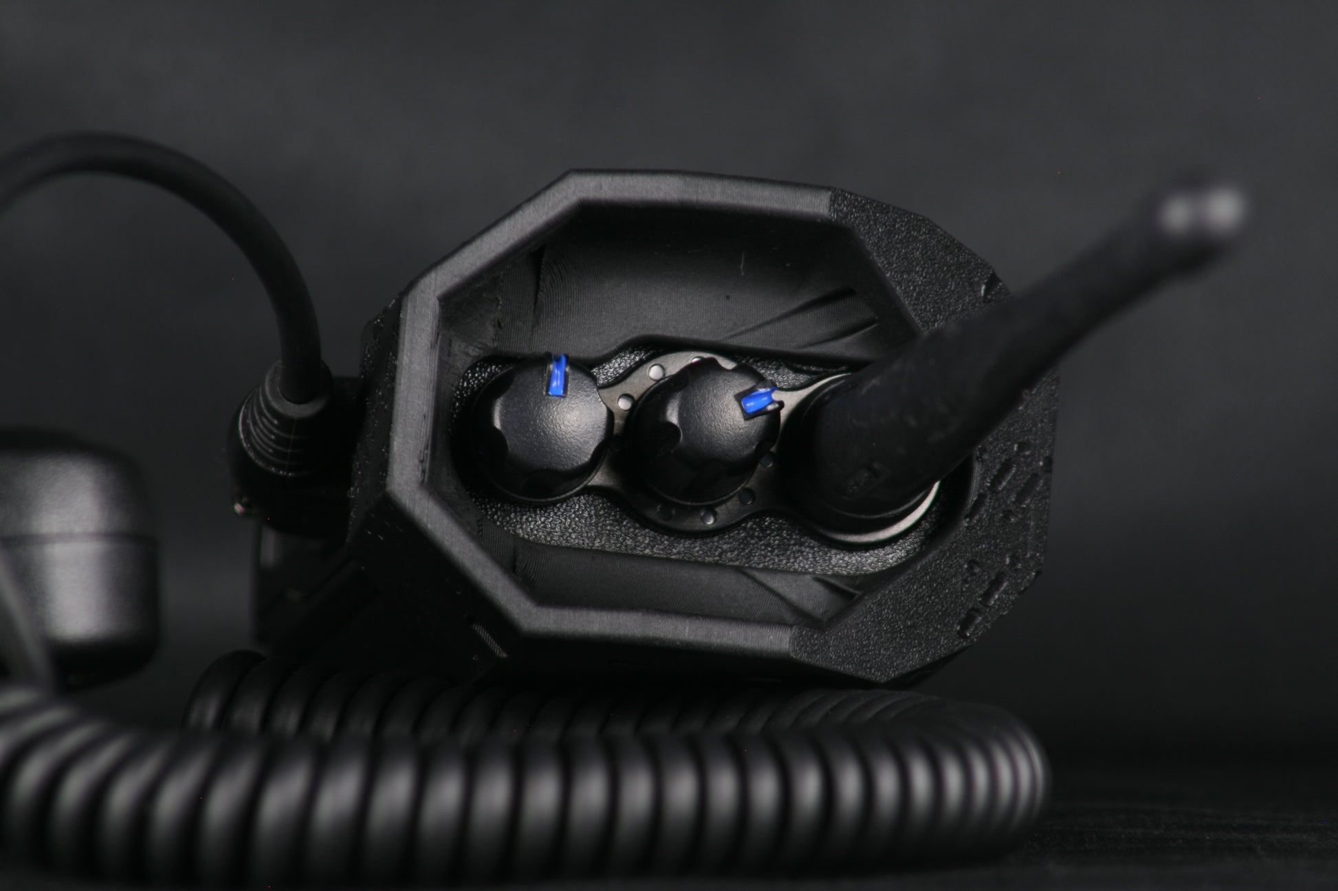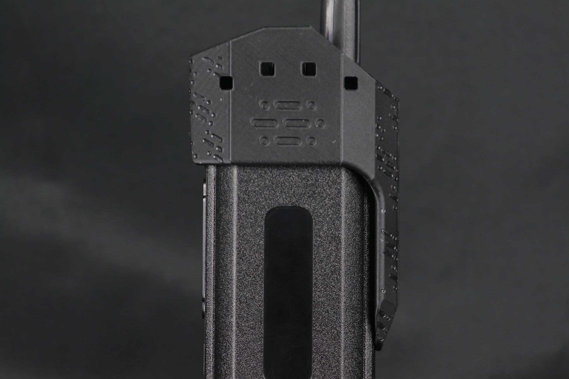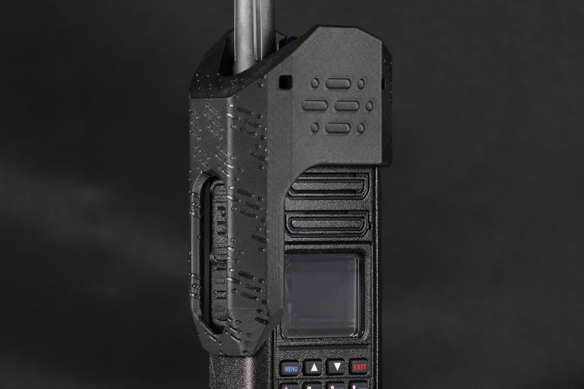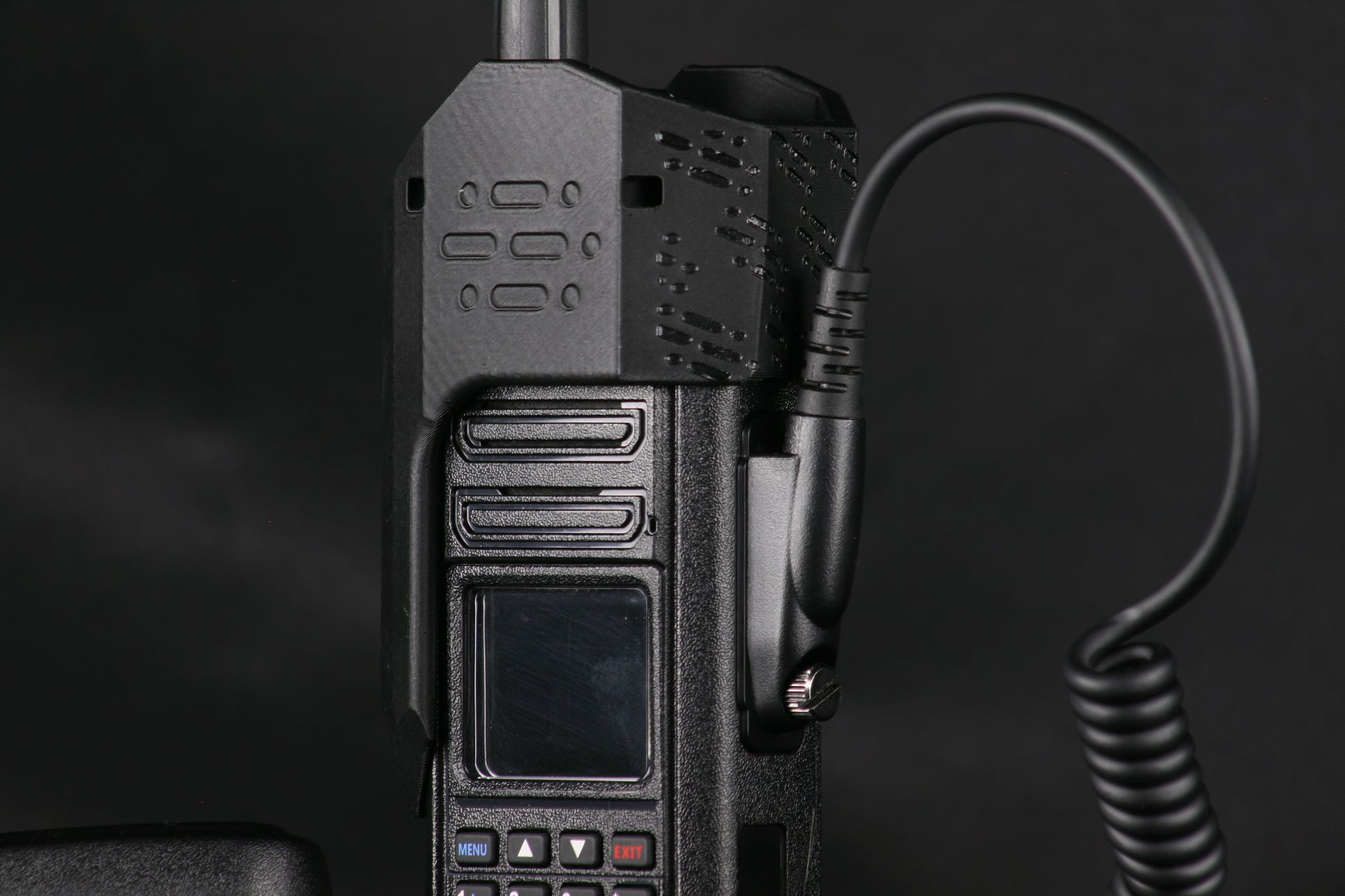Through-holes in the dial protection wings are sized to allow for common cordage options for “dummy-cording” to your person and/or hanging the radio. Compatible with common MIL-SPEC Paracord, Shock Cord, Positive-Locking Cord, etc as well as zip ties, cable ties, metal cable, large key-rings, etc.