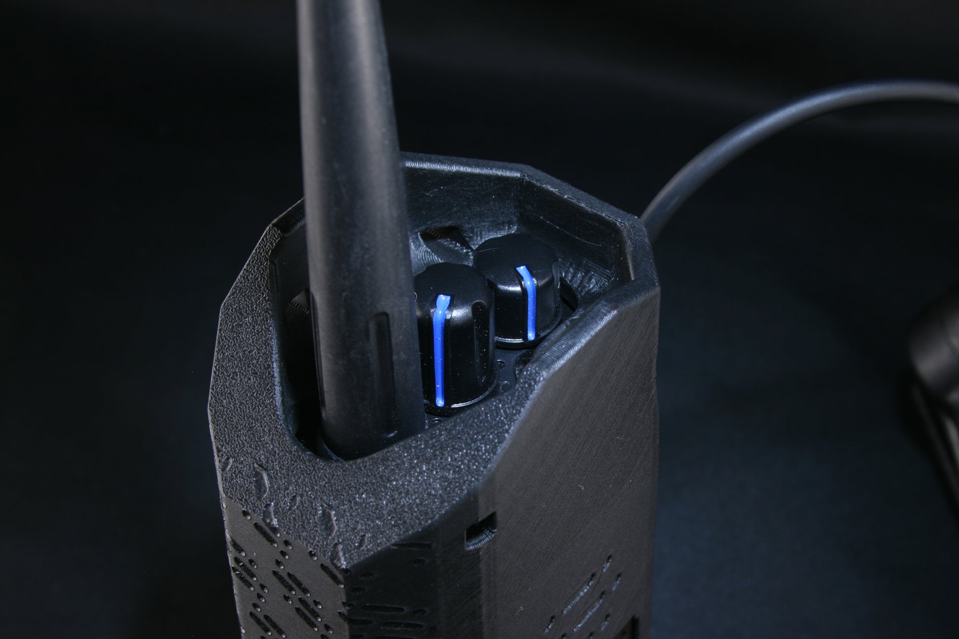 Through-holes in the dial protection wings are sized to allow for common cordage options for “dummy-cording” to your person and/or hanging the radio. Compatible with common MIL-SPEC Paracord, Shock Cord, Positive-Locking Cord, etc as well as zip ties, cable ties, metal cable, large key-rings, etc.