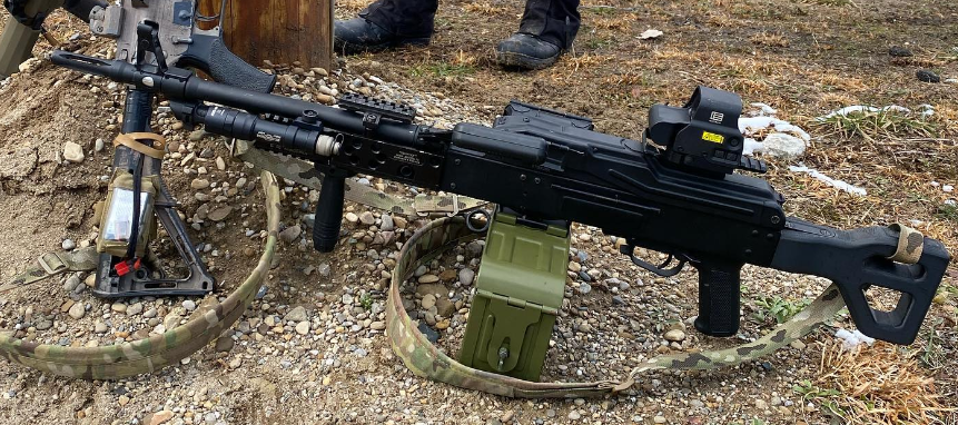 Shortened stubby stock for the airsoft A&K brand PKM Medium Machine Gun (MMG) that permits easier shouldering and unsupported firing especially when wearing armor, gear, and/or thick clothing.
